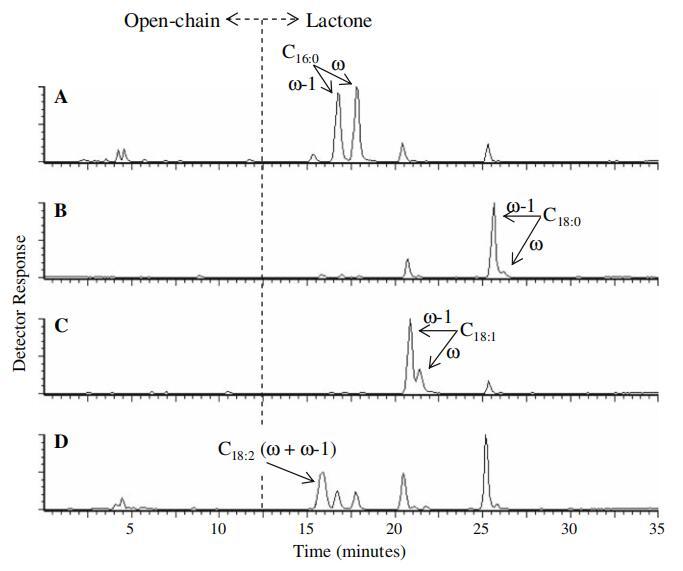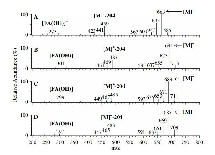 圖3正大氣壓化學(xué)電離(APCI)-來自圖2中每個TIC色譜圖基峰的質(zhì)譜圖。 圖2的TIC中的C16:0二乙酰化槐脂內(nèi)酯(RT=16.7分鐘)、圖2的TIC中的C18:0二乙?;敝瑑?nèi)酯(RT=25.2分鐘)、圖2c的TIC中的C18:1二乙?;敝瑑?nèi)酯(RT=20.7分鐘)和圖2d的TIC中的C18:2二乙?;敝瑑?nèi)酯(RT=15.8)。 ([M]+=質(zhì)子化分子離子;[M]+-204=質(zhì)子化分子離子-減去乙?;禾牵ㄙ|(zhì)量204);[FA(OH)]+=質(zhì)子化羥基脂肪酸)