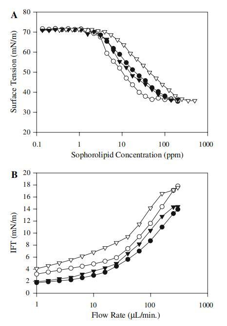槐脂(SLs)相對較大的生產(chǎn)能力、可再生性和“生態(tài)友好性”有助于提高其作為家庭和個人護理產(chǎn)品中某些石化表面活性劑的添加劑或替代品的工業(yè)意義。 然而,為了考慮用于工業(yè)用途,SLs也必須廉價生產(chǎn),并且必須了解和控制其物理性質(zhì),以便準(zhǔn)確預(yù)測SLs在各種應(yīng)用中的潛力。 表面張力(ST)、臨界膠束濃度(CMC)、界面張力(IFT)和水溶性是表面活性劑應(yīng)用特別關(guān)注的四個性質(zhì)。 理想情況下,良好的表面活性劑是水溶性的,表現(xiàn)出較低的CMC,并導(dǎo)致最小表面張力(min.ST)小于30 mN/m。 這些性質(zhì)中的每一種都可以根據(jù)表面活性劑的化學(xué)組成進行控制。 通過在多種不同的混合基質(zhì)(包括葡萄糖和4種不同的脂肪酸)上生長棉鈴蟲,我們產(chǎn)生了具有不同化學(xué)分布的SLs。 簡單地通過改變脂肪酸來生產(chǎn)不同的SLs的能力提供了在發(fā)酵水平上管理物理性質(zhì)的前景,并通過在應(yīng)用水平上以不同的比例混合SLs。