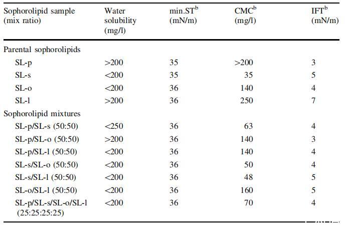 4個(gè)親代SLs中的每一個(gè)都產(chǎn)生了35–36 mN/m的可比最小ST,但CMC值明顯不同(表3)。 SL-p和SL-l的CMC值均大于200 mg/l,而SL-s和SL-o的CMC值分別為35 mg/l和140 mg/l。 IFT值范圍為3 mN/m(SL-p)至7 mN/m(SL-l)。 為了控制SLs的表面活性,以50:50的混合比制備混合物,并重新評(píng)估其性能。 各混合物的內(nèi)酯分布見(jiàn)表2。 經(jīng)分析,最小ST和IFT相對(duì)不變,但CMC值確實(shí)因SL混合物而異。 通過(guò)混合獲得了介于48 mg/l和140 mg/l之間的臨界膠束濃度。 有趣的是,CMC值最低的SL混合物都含有SL-s成分。 特別是SL-s的CMC值為35 mg/l; 即使是以25:25:25:25的比例包含所有4種親本SL的混合物,其CMC值(70 mg/l)也比不含SL-s成分的其他混合物低。 這些數(shù)據(jù)表明,SL-s對(duì)水的表面活性性能的影響更為顯著。 通過(guò)使用較少的SL-s,可以實(shí)現(xiàn)相等的最小ST和IFT。 性能控制和高產(chǎn)量將通過(guò)降低成本最終有助于SLs的工業(yè)應(yīng)用。 這些數(shù)據(jù)還指出,通過(guò)將不同的SLs混合在一起以獲得所需的性質(zhì),可以在一定程度上控制SLs的表面活性性質(zhì)。 雖然未達(dá)到表明這些SLs單獨(dú)具有優(yōu)越表面活性劑性能的最低標(biāo)準(zhǔn),但其性能可能足以允許其作為石化表面活性劑添加劑的使用量增加,以便在大量使用表面活性劑的應(yīng)用中盡量減少不利的環(huán)境影響。 SL-p和SL-l的CMC值均大于200 mg/l,而SL-s和SL-o的CMC值分別為35 mg/l和140 mg/l。IFT值范圍為3 mN/m(SL-p)至7 mN/m(SL-l)。為了控制SLs的表面活性,以50:50的混合比制備混合物,并重新評(píng)估其性能。各混合物的內(nèi)酯分布見(jiàn)表2。經(jīng)分析,最小ST和IFT相對(duì)不變,但CMC值確實(shí)因SL混合物而異。通過(guò)混合獲得了介于48 mg/l和140 mg/l之間的臨界膠束濃度。有趣的是,CMC值最低的SL混合物都含有SL-s成分。特別是SL-s的CMC值為35 mg/l;通過(guò)將SL-s與SL-p、SL-o和SL-l以50:50的比例混合,CMC值分別增加到63 mg/l、50 mg/l和48 mg/l。即使是以25:25:25:25的比例包含所有4種親本SL的混合物,其CMC值(70 mg/l)也比不含SL-s成分的其他混合物低。這些數(shù)據(jù)表明,SL-s對(duì)水的表面活性性能的影響更為顯著。通過(guò)使用較少的SL-s,可以實(shí)現(xiàn)相等的最小ST和IFT。性能控制和高產(chǎn)量將通過(guò)降低成本最終有助于SLs的工業(yè)應(yīng)用。這些數(shù)據(jù)還指出,通過(guò)將不同的SLs混合在一起以獲得所需的性質(zhì),可以在一定程度上控制SLs的表面活性性質(zhì)。雖然未達(dá)到表明這些SLs單獨(dú)具有優(yōu)越表面活性劑性能的最低標(biāo)準(zhǔn),但其性能可能足以允許其作為石化表面活性劑添加劑的使用量增加,以便在大量使用表面活性劑的應(yīng)用中盡量減少不利的環(huán)境影響。