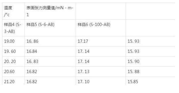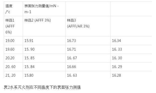 溫度條件對于液體表面張力存在著很大的影響。大量試驗數(shù)據(jù)表明,液體的表面張力會隨著溫度的升高而降低。通過對一系列流體滅火劑產(chǎn)品,包括不同配比的泡沫滅火劑(成膜型)、水系滅火劑等樣品進行測試,可以清晰地從表1、表2中看出,溫度的變化對流體型滅火剤的表面張力存在一定程度的影響。