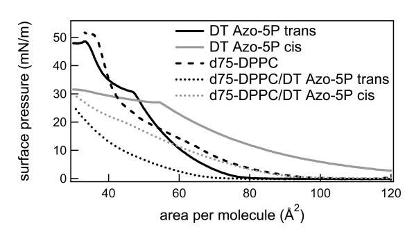 圖2。反式和順式狀態(tài)下的光開關(guān)脂質(zhì)DT Azo-5P(實(shí)線)、d75-DPPC(虛線)以及光開關(guān)兩種狀態(tài)下的1:5摩爾比的光開關(guān)脂質(zhì)和d75-DPPC(虛線)的表面壓力與面積等溫線。