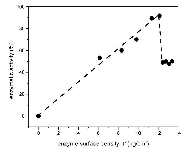 圖2.估計(jì)酶表面密度的影響(Γ)關(guān)于PNPPA酶活性。酶活性表示為在均勻介質(zhì)中測得的酶活性的百分比。最大值對(duì)應(yīng)于12.1 ng/cm2的酶表面密度。0-12 ng/cm2的范圍對(duì)應(yīng)于0-18 mN/m的表面壓力;但是,觀察到,在圖中所示的最高表面密度中,曲線不是t線性。圖3更好地分析了對(duì)表面壓力的依賴性。
