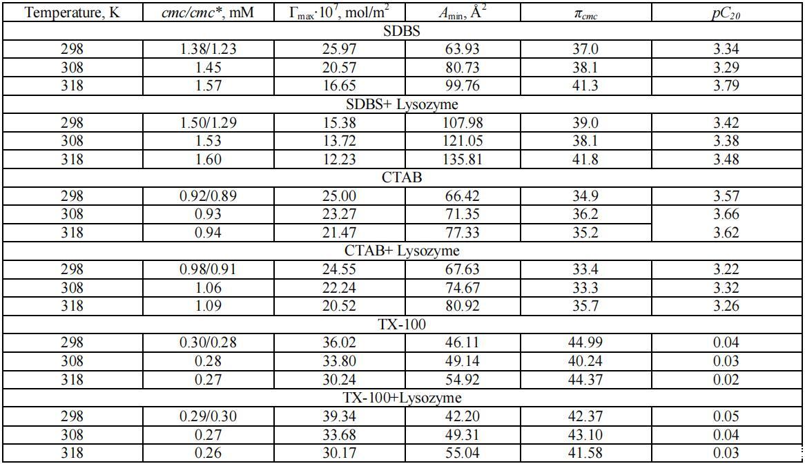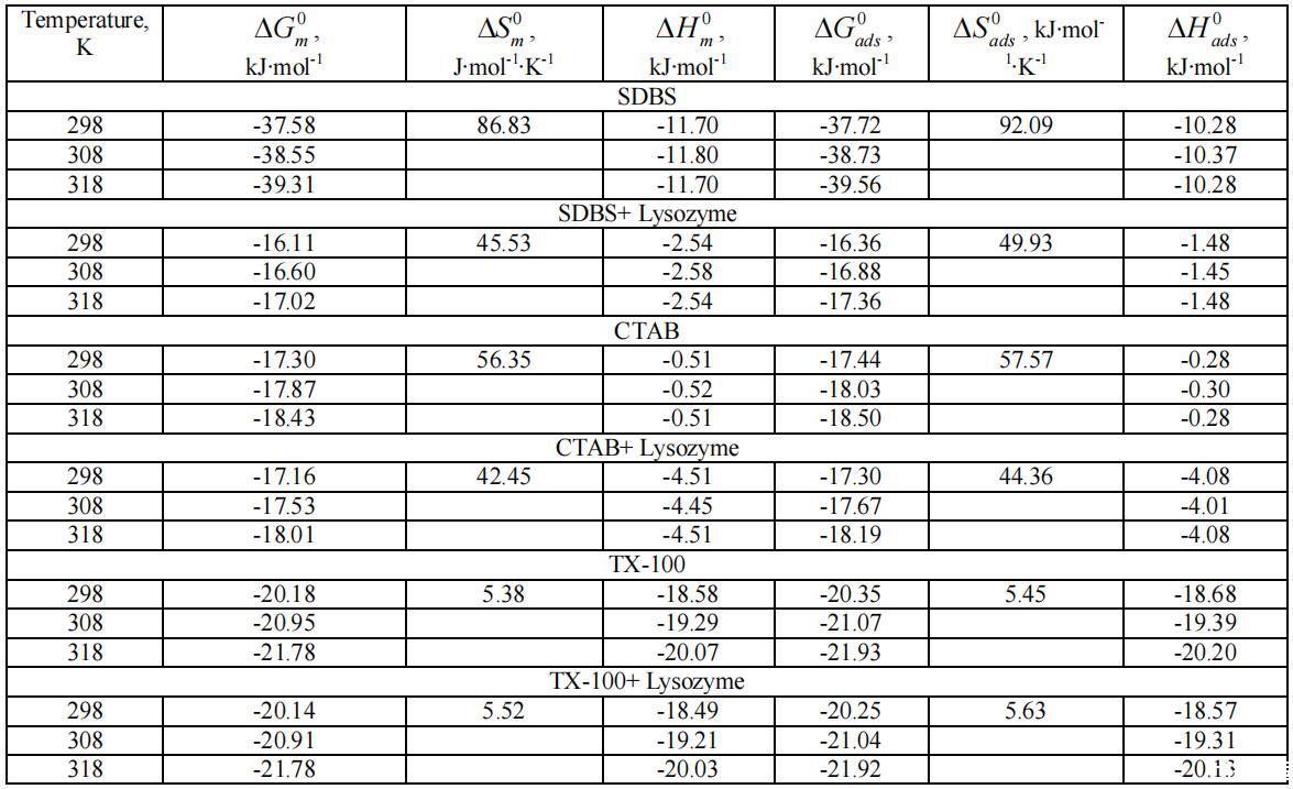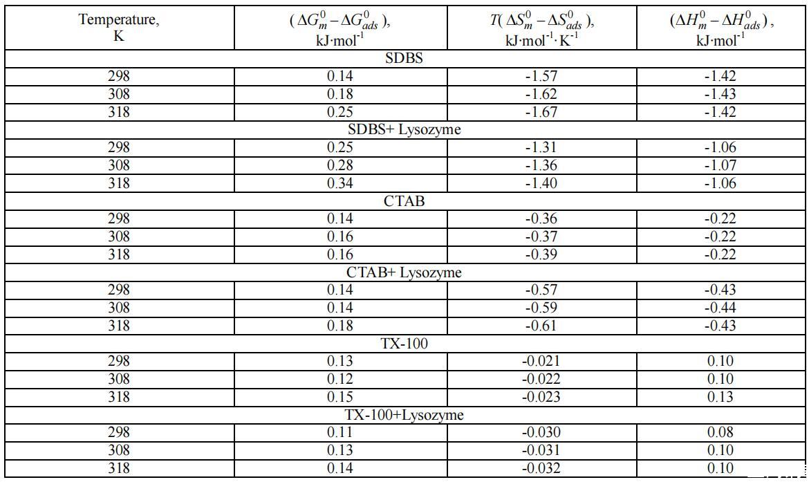 在溶菌酶存在和不存在的情況下,不同種類表面活性劑的物理化學和熱力學性質(zhì)如下所述: