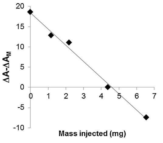 脂質體(不同濃度)對BSP蛋白的作用也如圖5所示。脂質體在進入亞階段前與精漿接觸。隨著脂質體中濃度的增加(曲線M/SP+C1至C4),BSP蛋白吸附引起的表面積增加逐漸延遲并減少。當含量達到4.37 mg(C3)時,界面上仍有少量BSP蛋白摻入,1600 s時出現(xiàn)肩部。在最高濃度(C4)下,未觀察到BSP蛋白摻入,分子面積的變化甚至比對照曲線更負,表明膜組分在亞相中輕微溶解。因此,脂質體作用于BSP蛋白的方式與LDL相同。最有趣的比例似乎介于C3和C4之間。根據確定面積變化與脂質體注射磷脂質量之間相互作用的曲線計算得出(圖6)。注射26.6 mg BSP的最佳質量為4.6 mg,即PC:BSP比為0.16(w/w)。