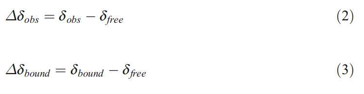 在任何給定的α-環(huán)糊精濃度下,結(jié)合表面活性劑分子的分?jǐn)?shù)都可以通過(guò)其信號(hào)的化學(xué)位移來(lái)確定??腕w分子在束縛態(tài)(δ束縛態(tài))和自由態(tài)(δ自由態(tài))有不同的化學(xué)位移。在自由形式和束縛形式之間的平衡以及這兩種狀態(tài)之間的交換率(比共振頻率差快)的情況下,將僅觀察到一個(gè)具有觀測(cè)到的化學(xué)位移(δobs)的信號(hào),即δ束縛和δ自由之間的加權(quán)平均數(shù)。對(duì)于以下內(nèi)容,我們定義了觀察到的化學(xué)位移變化(?δobs)和結(jié)合時(shí)化學(xué)位移的變化(?δ界):