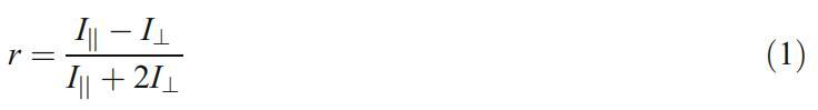 使用熒光偏振儀系統(tǒng)(Beacon 2000)在25.0±0.2°C下進(jìn)行所有熒光各向異性測(cè)量。RB用作熒光探針,其濃度保持在0.1μM。分別使用570和630 nm的激發(fā)和發(fā)射波長(zhǎng)測(cè)量熒光各向異性。當(dāng)發(fā)射偏振器平行或垂直于偏振激發(fā)方向時(shí),每個(gè)熒光強(qiáng)度稱(chēng)為I||或I┴,分別地各向異性是強(qiáng)度差(I||-I)的比率┴)總強(qiáng)度(I||+2I)┴)如等式1[24,25]所示: