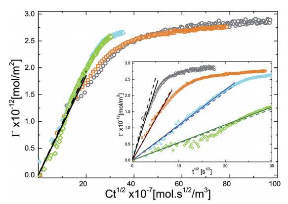 圖5吸附量(G)作為產(chǎn)品Ct1/2的函數(shù)。插圖顯示了不同體積濃度的微凝膠顆粒的G與t1/2的單獨曲線:(>)0.10 G l-1,(D)0.20 G l-1,(,)0.50 G l-1,(B)1.00 G l-1。實線是直線擬合,虛線是使用D=DDL計算的坡度繪制的。