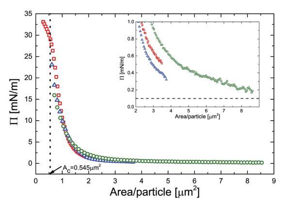 壓力-面積等溫線是通過在Langmuir槽上對擴散單分子膜進(jìn)行3組不同實驗得到的。這些等溫線中的面積坐標(biāo)根據(jù)吸附在界面上的顆粒數(shù)量進(jìn)行縮放。如圖1所示,所有曲線都折疊到一個圖上。在增加壓縮時,壓力最初略有變化,但低于2 mm2/顆粒時,壓力急劇增加。曲線的斜率首先增加,但在約27 mN m-1處達(dá)到最大值,在此有一個拐點,然后是一個稍弱的斜率。如圖1中的虛線所示,對應(yīng)于該拐點的每粒子面積(Ac)值為0.545 mm2。假設(shè)粒子緊密堆積,這對應(yīng)于~835 nm的粒子間距離,遠(yuǎn)大于在本體溶液中測量的粒子流體動力學(xué)直徑(590 nm),表明粒子確實發(fā)生了實質(zhì)性變形。如圖1的插圖所示,0.5 mN m-1級的有限表面壓力(即遠(yuǎn)高于我們的檢測極限0.1 mN m-1)實際上已經(jīng)可以在約4 mm2的每粒子面積上測量。插圖還表明,在兩個不同的朗繆爾槽上進(jìn)行的不同實驗之間,P的絕對值在0.3 mN m-1范圍內(nèi)可重復(fù)。
