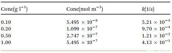 表2根據(jù)圖6中的實驗曲線計算的各種濃度的速率常數(shù)k(1/s)值