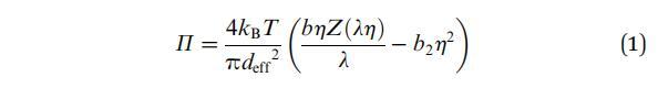 吸附在流體-流體界面上的顆粒相互作用并產(chǎn)生表面壓力(P),這是3D系統(tǒng)中壓力的2D模擬。通過進(jìn)一步擴展這種類比,還可以通過狀態(tài)方程將表面壓力與其他狀態(tài)參數(shù)(如數(shù)密度和溫度)聯(lián)系起來。對于吸附在流體-流體界面上的膠體粒子,最簡單的近似可能是2D硬盤。單組分系統(tǒng)的狀態(tài)方程(EOS)是根據(jù)壓縮因子Z的密度依賴性給出的。文獻(xiàn)中充滿了多種方法來提供2D硬盤流體狀態(tài)方程的表達(dá)式。Mulero等人27,28簡要回顧和比較了所有這些狀態(tài)方程。