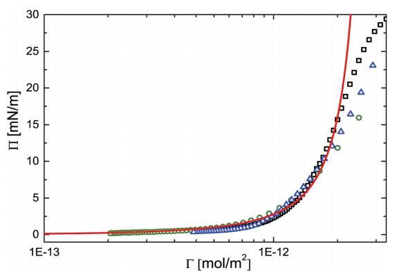 圖2表面壓力(P)與空氣-水界面上PNIPAM顆粒吸附量(G)的關(guān)系。開放符號表示與三組不同實驗相對應(yīng)的實驗數(shù)據(jù)點,即:(,)具有高初始顆粒負(fù)荷的NIMA槽,(B)具有低初始顆粒負(fù)荷的NIMA槽和(D)具有高初始顆粒負(fù)荷的Kibron m槽。紅色實線表示使用Groot和Stoyanov模型進(jìn)行的預(yù)測。