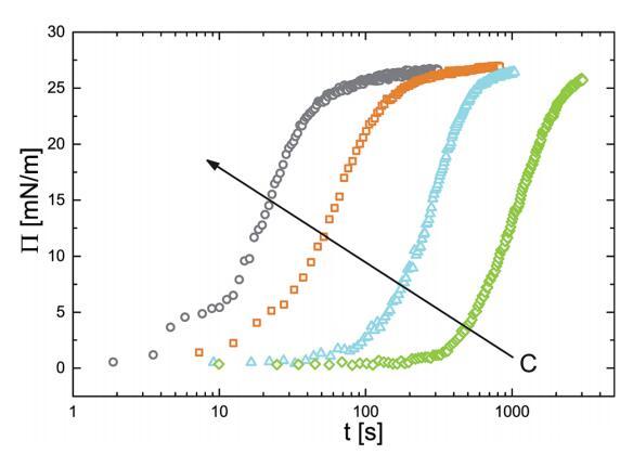 在建立了一個狀態(tài)方程來關(guān)聯(lián)表面壓力和吸附量之后,我們現(xiàn)在開始研究粒子的吸附動力學(xué)。為此,我們監(jiān)測了PNIPAM顆粒懸浮液中新制備氣泡的界面張力隨時間的變化。我們將界面張力值轉(zhuǎn)換為表面壓力。結(jié)果如圖4所示。表面壓力值最初迅速增加,然后放松到最終平衡值。動力學(xué)可以清楚地分為兩個獨立的時間尺度:一個是表面壓力值增加表示的初始快速動力學(xué),另一個是系統(tǒng)向最終平衡狀態(tài)松弛時的緩慢部分。短時間快速動力學(xué)和長時間慢得多動力學(xué)之間的區(qū)別是許多表面活性材料吸附行為的特征。32,33
