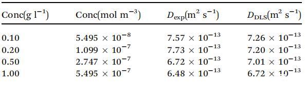 表1根據(jù)實驗G與t1/2曲線計算的不同濃度的擴散系數(shù)D(m2 s-1)值與使用DLS測量的值相比