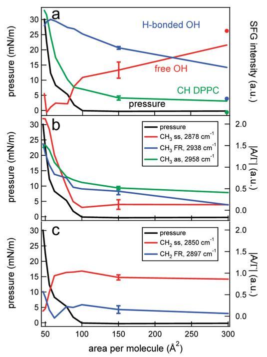 圖6。(a)DPPC的CH信號(hào)(綠色)、Hbonded OH信號(hào)(藍(lán)色)和游離OH信號(hào)(紅色)的表面壓力(黑色,左軸)和積分SFG強(qiáng)度(右軸)作為每個(gè)分子面積的函數(shù)。數(shù)據(jù)點(diǎn)是通過整合特定光譜區(qū)域獲得的,該區(qū)域由圖5的光譜中的彩色方塊標(biāo)記。純水層的CH、OH和游離OH面積(在表面活性劑攤鋪前測量)分別表示為綠色、藍(lán)色和紅色圓點(diǎn)。為清晰起見,集成SFG信號(hào)已被標(biāo)準(zhǔn)化,并且彼此略微偏移。(b)表面壓力(黑色,左軸)和不同CH3共振(右軸)的絕對振幅/帶寬比(|A/Γ|),通過使用洛倫茲線型模型擬合圖5中的數(shù)據(jù)獲得。(c)和b一樣,但是對于CH2共振。典型誤差條如圖所示。