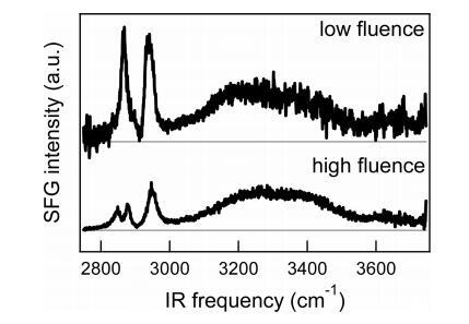 高密度下不同的SFG光譜是激光注量的函數(shù)。通過比較在不同通量下測得的高壓(高脂密度)下脂層的兩個(gè)SFG光譜(圖7),在CH峰處觀察到差異,而水帶大致相同。在相對較高的通量下(底部面板)~10 mJ/cm2,CH2峰值為2850 cm?1仍然清晰可見,而該峰值在低通量的頂部面板中不存在(~1.5 mJ/cm2)。此外,在高通量譜中,CH3峰的強(qiáng)度(2880和2950 cm?1)與低通量測量相比,相對于水而言,低通量測量。這兩個(gè)觀察結(jié)果清楚地表明,在高通量條件下,單層膜受到激光的影響:由于熱,尾部更加無序,導(dǎo)致更多的凹凸不平的缺陷,因此存在CH2峰和CH3信號(hào)減弱。顯然,激光的重復(fù)激發(fā)導(dǎo)致了從具有有序尾的凝膠狀態(tài)到具有較少有序尾的液晶狀態(tài)的相變。30,因?yàn)閷?shí)驗(yàn)是在室溫下進(jìn)行的(~23°C),相變溫度為41°C,30我們可以得出結(jié)論,在高通量情況下,樣品的穩(wěn)態(tài)加熱至少為18°C,考慮到基于焦點(diǎn)尺寸和紅外光穿透深度(見附錄)估計(jì)的單發(fā)溫升在2到19°C之間(取決于紅外頻率),這并非不合理。對于低通量情況(頂部面板),穩(wěn)態(tài)溫升不超過18°C,因?yàn)槲覀內(nèi)匀豢梢钥吹接行虻奈膊浚ㄟ^停止槽的旋轉(zhuǎn)指示凝膠狀態(tài)。