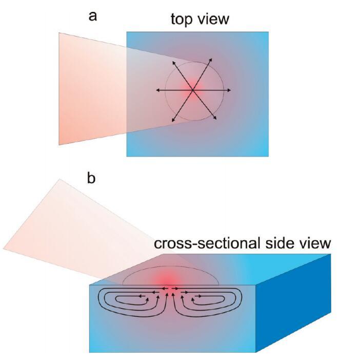 圖4。水樣近表面區(qū)域穩(wěn)態(tài)加熱引起的流動(dòng)示意圖。溫度示意圖上用顏色表示,其中紅色表示熱,藍(lán)色表示冷。橙色陰影區(qū)域顯示入射到表面的激光束,箭頭表示溫度梯度誘導(dǎo)流動(dòng)的方向。(a)俯視圖,顯示近表面區(qū)域的徑向位移,(b)橫截面?zhèn)纫晥D,顯示產(chǎn)生的Marangoni流動(dòng)單元。請注意,在焦點(diǎn)的中心,水流向上,因此表面可以有效地持續(xù)更新。