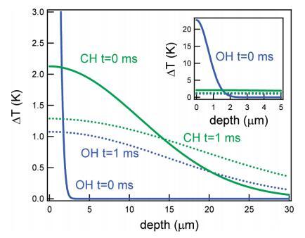 圖9。對于與CH(綠色)或OH(藍(lán)色)振動(dòng)共振的紅外光束,溫度隨著進(jìn)入水層的深度而升高。實(shí)線和虛線分別表示t=0和t=1 ms。插圖顯示了相同的圖形,但帶有擴(kuò)展的yaxis。