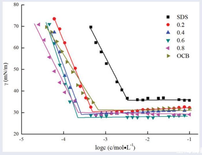 用表面張力法研究了橄欖油兩性表面活性劑(羧基甜菜堿OCB和磺基甜菜堿OSB)與陰離子表面活性劑十二烷基苯磺酸鈉(SDBS)在不同摩爾分?jǐn)?shù)下的表面性質(zhì)。研究了無機(jī)鹽(NaCl、MgCl2)的加入對OCB/SDBS和OSB/SDBS體系表面活性的影響。結(jié)果表明,這兩種混合體系在所研究的所有摩爾分?jǐn)?shù)上都比它們各自的組分具有更低的CMC值和更高的表面活性。同時,根據(jù)正規(guī)溶液理論,通過膠束相互作用參數(shù)(βm)確定了OCB/SDBS和OSB/SDBS之間明顯的協(xié)同作用。觀察到,αOCB=0.6時的OCB/SDBS混合體系和αOSB=0.6時的OSB/SDBS混合體系表現(xiàn)出最強(qiáng)的協(xié)同作用。此外,添加無機(jī)鹽后,二元表面活性劑混合物表現(xiàn)出更好的表面活性,并且無機(jī)鹽金屬離子的不同價態(tài)對混合體系的表面能力影響不同:Mg2+>Na+。