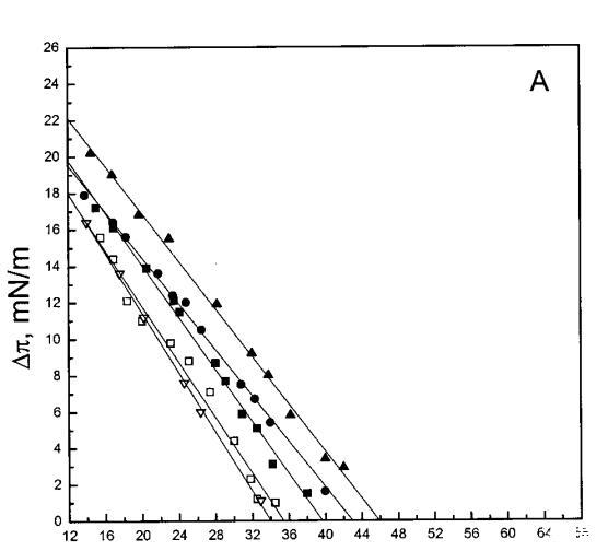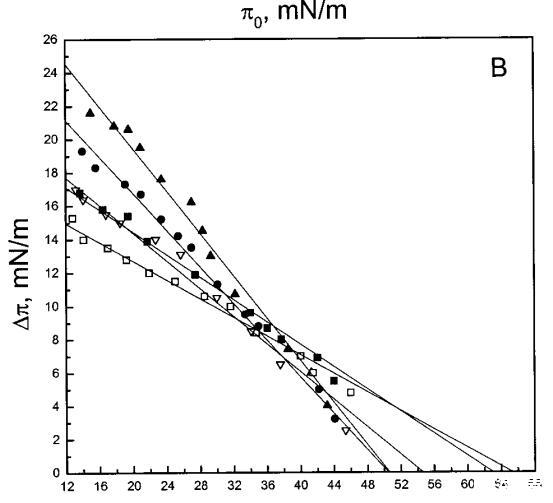 吲哚西丁的π也顯著增加,顯示其插入SOPC單層(圖1b)。然而,吲哚青素的膜活性明顯高于magainin 2,具有πc≈65mN/m,用于SOPC膠片。與magainin 2類似,單層中POPG含量的增加增強(qiáng)了吲哚青霉素的滲透,增加了?π低于~38 mN/m,與肽和脂質(zhì)單層之間的靜電相互作用一致。然而,在后一個表面壓力值之上,吲哚西丁引起的π增量被POPG減弱。因此,與magainin 2相反,在存在POPG的情況下,πc減?。▓D1c),在XPG=0.4時從~65 mN/m(對于SOPC單層)變?yōu)閪50 mN/m。在SOPC單層中,吲哚西丁增加的π也被膽固醇(X=0.1)增加,而πc降低至~54 mN/m。圖1所示的magainin 2和吲哚西丁的模式非常不同,后一種肽的明顯交叉點(diǎn)為~38 mN/m。