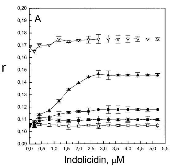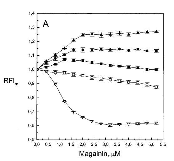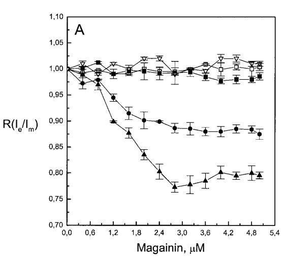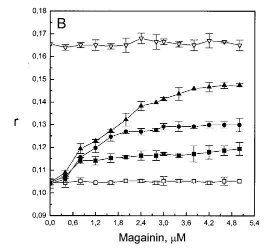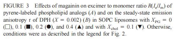 有趣的是,在存在酸性磷脂的情況下,肌動蛋白/脂質(zhì)的摩爾比(在該摩爾比下,肌動蛋白的初始增量趨于穩(wěn)定)分別為1:21、1:16和1:12.5,對應(yīng)于XPG=0.1、0.2和0.4(圖2A),分別產(chǎn)生1:2、1:3和1:5的肌動蛋白/磷脂化學(xué)計量比。同時,DPH的初始r增量在magainin/脂質(zhì)摩爾比為~1:30、1:12和1:5時趨于平穩(wěn)(XPG分別為0.1、0.2和0.4),對應(yīng)于大約1:3、1:2.5和1:2的magainin/PG化學(xué)計量比(圖3)。據(jù)報道,在這些肽/脂質(zhì)摩爾比下,magainin可插入含酸性磷脂的膜中(Ludtke等人,1994年)。此外,已經(jīng)證明,雙分子層中magainin的=-螺旋的方向取決于肽與脂質(zhì)的摩爾比,在上述化學(xué)計量比下,螺旋應(yīng)垂直于膜表面插入,在含PG的膜中形成孔(Ludtke等人,1996)。這些孔不僅由兩親螺旋的極性面組成,而且還由脂質(zhì)的極性頭基組成,內(nèi)外單層通過這些孔襯脂質(zhì)是連續(xù)的。膜中的這種結(jié)構(gòu)可能會降低探針芘部分微環(huán)境的極性,從而提高其量子產(chǎn)率。有趣的是,當(dāng)XPG>0.1時,magainin 2逐漸降低Ie/Im值(圖3 A),這與增強(qiáng)的?;滍樞驕p少脂質(zhì)側(cè)向擴(kuò)散的速率一致。然而,由于magainin 2已經(jīng)在XPG=0.1時增加了r,Ie/Im沒有變化,我們可以得出結(jié)論,PPDPG探針向微區(qū)富集以及其橫向擴(kuò)散的減少正在發(fā)生。