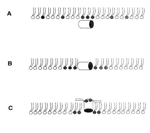 對于測試的所有單層組成,吲哚青霉素的πc值超過了馬蓋寧2的測量值(圖1 c),表明該肽在酰基鏈之間有效插入和插層。吲哚西丁在~38 mN/m的交叉點(diǎn)值得關(guān)注。在后一個表面壓力之下,表面壓力的增量??在PG存在的情況下,吲哚西丁引起的反應(yīng)增強(qiáng),而在較高的初始脂質(zhì)堆積密度下觀察到相反的反應(yīng)。有趣的是,不管脂質(zhì)成分(即PG的存在)如何,交叉點(diǎn)幾乎保持不變,因此表明它可以完全由表面壓力決定,而不管靜電相互作用如何。一種可能的機(jī)制是,在π0>38 mN/m時,吲哚西丁以壓力依賴的方式改變其在單層中的取向,可能是從其長軸相對于層平面的平行到垂直取向(圖9,B和C),從而減少面積/肽并減少?π.此外,一些靜電結(jié)合吲哚肽的PG分子也可能與單層中的磷脂方向不同。換句話說,吲哚西丁與其相關(guān)的PG將形成一種超分子復(fù)合物,其取向?qū)⑷Q于壓力。這在圖9中示意性地示出。重要的是,所提出的肽連接磷脂的重新定向?qū)⑴c最近提出的模型兼容,在該模型中,穿過雙層的孔表面的一部分將由脂質(zhì)頭基構(gòu)成(Ludtke et al.,1996)。
