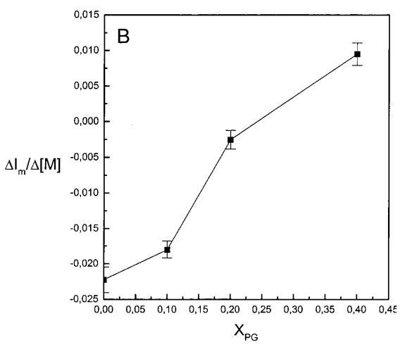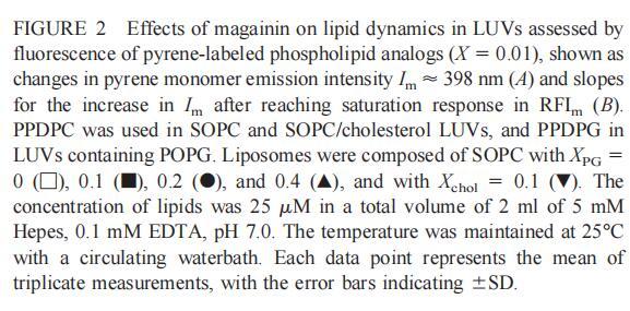 繼上述單層研究之后,有興趣探索肽對脂質(zhì)動力學(xué)的影響。這是通過使用熒光光譜和不同脂質(zhì)成分的LUV完成的,記錄芘標(biāo)記的熒光磷脂類似物PPDPC或PPDPG的發(fā)射光譜(均為X=0.01)。對于SOPC LUV,添加magainin 2導(dǎo)致芘熒光顯著猝滅,芘單體和準(zhǔn)分子發(fā)射強(qiáng)度平行降低,如Im所示(圖2)。作為XPG的一項功能,還研究了馬蓋寧2與脂質(zhì)體結(jié)合的后果。當(dāng)XPG從0.1增加到0.4時,觀察到由于magainin 2在398 nm處逐漸增強(qiáng)的Im(RFIm),而Im的初始增量在明確定義的PG/magainin 2化學(xué)計量比~2、3和5時趨于平穩(wěn)(圖2 A)。在這個初始階段之后,直到給定的化學(xué)計量比,還有第二個過程,其斜率也隨著XPG的增加而增加(圖2b)。在XPG=0和0.1時,Magainin 2僅引起Ie/Im的輕微變化,而在XPG=0.2和0.4時,分別減少10%和25%是明顯的(圖3 A)。為了區(qū)分脂質(zhì)動力學(xué)中兩種性質(zhì)不同的變化,即側(cè)向遷移率和微結(jié)構(gòu)域形成,作為上述Ie/Im變化的根本原因,我們還通過測量DPH的熒光各向異性r來評估酰基鏈順序的變化(圖3 B)。在缺乏酸性磷脂的情況下,Magainin 2幾乎不會引起r的變化(圖3B)。然而,隨著XPG的增加,加入magainin 2后脂質(zhì)堆積和?;滍樞蛑饾u增加(圖3b),XPG=0.4時,r最大增加1.4倍。值得注意的是,XPG=0.1時Ie/Im沒有變化以及?;滍樞虻脑黾颖砻鱌PDPG正在發(fā)生微觀富集。有趣的是,在存在膽固醇(Xchol=0.1)的情況下,由于馬蓋寧2的作用,Im和Ie都顯著降低,Ie/Im的變化不顯著(圖2A和3A)。如前所述(van Ginkel et al.,1989),添加肽前r的增加(圖3 B)揭示了通過在膜中摻入膽固醇而增強(qiáng)的膜順序。然而,在膽固醇存在的情況下,magainin 2對r沒有進(jìn)一步的影響(Xchol=0.1,圖3b)。