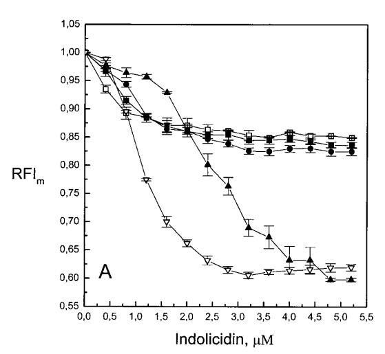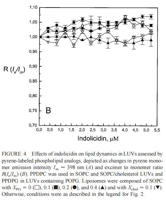 與magainin 2類似,吲哚青霉素與陰離子和兩性離子囊泡的膜結(jié)合非常不同(圖1b、4和5),與先前的平衡透析研究一致(Ladokhin et al.,1997)。雖然芘熒光的猝滅顯示吲哚肽被分配到SOPC雙層中,但對膜?;滍樞驇缀鯖]有影響(圖5)。相反,吲哚西啶與陰離子膜的相互作用導(dǎo)致脂酰鏈順序增加,明顯表現(xiàn)為DPH熒光各向異性增加,并對XPG呈S形依賴(圖5)。與magainin 2相反,吲哚西丁導(dǎo)致芘單體和準(zhǔn)分子發(fā)射強(qiáng)度顯著平行降低,與脂質(zhì)成分無關(guān),Ie/Im變化較?。▓D4)。相應(yīng)地,吲哚西丁誘導(dǎo)酸性PG富集到微區(qū)。有趣的是,在吲哚西丁/脂質(zhì)摩爾比為1:20以下,芘Im的減少順序?yàn)閄PG=0.40.20.10(圖4a),而在吲哚西丁/脂質(zhì)摩爾比為1:10時,Im的減少對XPG的依賴性相反。這種變化的可能機(jī)制如下。在低肽/脂摩爾比時,吲哚西丁似乎被調(diào)節(jié)到雙層界面(Ladokhin等人,1997),芘標(biāo)記鏈的鏈反轉(zhuǎn)(Holopainen等人,1999)使該部分更接近雙層表面,從而允許其與吲哚西丁的基本殘基接觸。后者通過π-陽離子相互作用導(dǎo)致芘部分的碰撞猝滅。然而,隨著XPG的增加,我們可以預(yù)期PG頭基與吲哚西丁的堿性殘基發(fā)生靜電結(jié)合,從而阻止芘與吲哚西丁的陽離子殘基之間的直接接觸。隨著肽濃度的增加,吲哚肽的膜結(jié)合以協(xié)同方式增強(qiáng),猝滅效率的逆轉(zhuǎn)可能涉及雙分子層中脂肽復(fù)合物的聚集。因此,在酸性含磷脂的膜中,吲哚對芘的猝滅作用較小。當(dāng)吲哚肽的濃度增加到肽/脂比1:10以上時,肽將以高度協(xié)同的方式并入膜的?;渽^(qū)域(Ha等人,2000)(圖9 E),而在中性膜中,肽位于界面(圖9 D)。插入吲哚西丁的量取決于雙層中的XPG,導(dǎo)致吲哚西丁的Trp殘基的猝滅占主導(dǎo)地位,與XPG=0.4時Im的顯著減少一致(圖4a)。