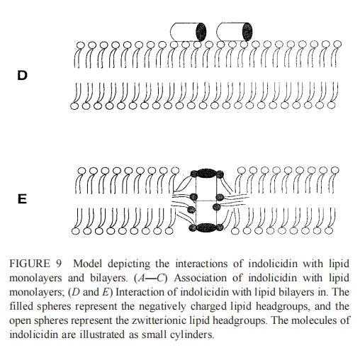 吲哚西丁只含有13個氨基酸,因此太短,無法跨越雙層。然而,該肽可以作為聚集物或帶有相關(guān)酸性磷脂的頭尾二聚體橫跨雙層(圖9 E),從而導(dǎo)致膜不穩(wěn)定性。已經(jīng)證明,吲哚西丁能夠通過穿過外膜殺死革蘭氏陰性細(xì)菌,并通過形成通道破壞細(xì)胞質(zhì)膜(Falla et al.,1996)。與magainin 2的作用相比,吲哚青霉素誘導(dǎo)的內(nèi)吞小泡較?。▓D7)可能反映了這些肽與脂質(zhì)相互作用的不同模式。一些吲哚肽分子可能會轉(zhuǎn)移到膜的內(nèi)部小葉中。除了具有廣譜的抗真菌和抗菌活性外,吲哚西丁對哺乳動物細(xì)胞也有毒性(Schluesener等人,1993年;Ahmad等人,1995年)。有趣的是,吲哚西丁對SOPC和SOPC膽固醇巨型脂質(zhì)體的作用不同。在這一階段,根本原因尚不確定,可能與膽固醇對雙層結(jié)構(gòu)以及吲哚肽在膜中的取向的影響有關(guān)。因此,需要進(jìn)一步的研究來闡明膽固醇對吲哚肽膜結(jié)合的影響。