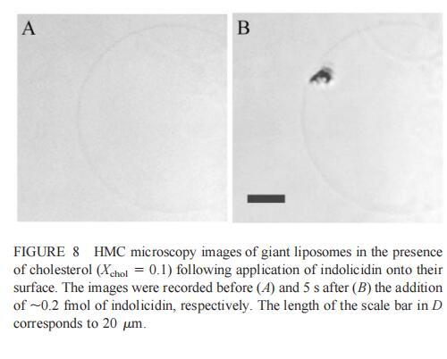 隨后,我們研究了吲哚西丁對由SOPC和膽固醇組成的巨大脂質(zhì)體(Xchol?0.1)的影響。吲哚西丁在膽固醇存在的情況下也會引起巨大脂質(zhì)體的起泡。形成的內(nèi)吞小泡在巨大小泡的表面上深度聚集(圖8b)。具體地說,在添加約0.2 fmol吲哚西啶(~400 fl,20次注射,圖8 B)后約5 s內(nèi),巨大脂質(zhì)體表面出現(xiàn)一簇小顆粒。隨后,聚集物轉(zhuǎn)移到巨大的脂質(zhì)體中,同時也有少量內(nèi)吞顆粒(θ≈0.9米)處可見。進(jìn)一步添加吲哚西丁會增加這些顆粒的數(shù)量,并導(dǎo)致巨大脂質(zhì)體收縮。然而,即使在暴露于~2 fmol吲哚西?。?00次注射,數(shù)據(jù)未顯示)的情況下,膜大體上仍保持完整。