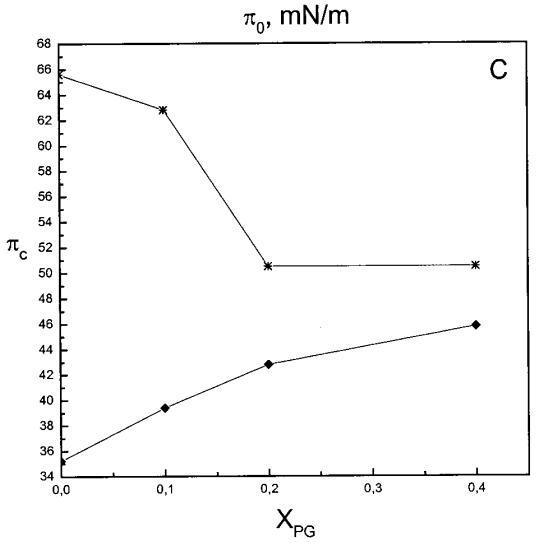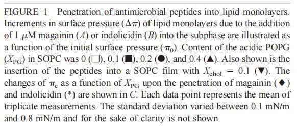 通過測量表面壓力的增量,觀察到抗菌肽在不同初始表面壓力(π0)下嵌入到空氣/水界面上的脂質(zhì)單層中(?π)將肽添加到亞相后(Brockman,1999;Verger和Pattus,1976)。Magainin 2在π0>12 mN/m時容易插入SOPC單層(圖1A),而在π0以上≈35 mN/m時,其在膜中的滲透被消除,因此該值表示該肽與SOPC膜相互作用的臨界包裝壓力πc。根據(jù)其凈正電荷4(Matsuzaki,1998),當(dāng)膜中酸性磷脂POPG的含量增加時,magainin 2向脂質(zhì)單層的滲透逐漸增強(qiáng)(圖1 A)。因此,消除magainin 2插入單層的πc值增加至~39(XPG=0.1)、43(XPG=0.2)和46 mN/m(XPG=0.4)(圖1c)。相反,在SOPC膜中加入膽固醇(Xchol=0.1)對magainin 2的滲透沒有顯著影響(圖1A)。