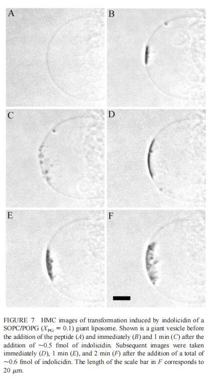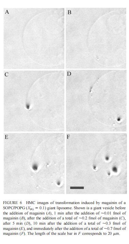 由于上述magainin 2和吲哚西啶對單層和LUV具有明顯的脂質(zhì)成分依賴性作用,因此有興趣使用巨型脂質(zhì)體比較這些肽對宏觀膜的三維拓?fù)浣Y(jié)構(gòu)的影響,無論是否含有PG,都可以在交流電場中形成由SOPC組成的巨大脂質(zhì)體。即使暴露于大量肽(~2 fmol,~4 pl=200次重復(fù)注射,數(shù)據(jù)未顯示),SOPC膜也不受magainin 2的影響。同樣,由SOPC和膽固醇(Xchol=0.1)組成的巨大脂質(zhì)體也不受此量的馬蓋寧2的影響(數(shù)據(jù)未顯示)。然而,在存在POPG(XPG=0.1)的情況下,已經(jīng)~0.01 fmol(單次~20 fl注射)的magainin 2應(yīng)用于巨大囊泡表面,顯著影響巨大脂質(zhì)體膜的拓?fù)浣Y(jié)構(gòu)(圖6 B)。更具體地說,在~1分鐘內(nèi),小顆粒(θ≈0.9米)出現(xiàn)在巨大的囊泡內(nèi)。隨后注射高達(dá)~0.1 fmol(約200 fl)的magainin 2不會引起進(jìn)一步的可見變化。在總共添加約0.2 fmol的肽后,膜開始起伏,形成致密顆粒(θ≈4 m)在巨大脂質(zhì)體內(nèi)可見(圖6 C)。在~5分鐘內(nèi),幾個小顆粒(θ≈0.9 m)出現(xiàn)在巨大脂質(zhì)體膜的內(nèi)表面(圖6 D)。隨后,大多數(shù)小顆粒進(jìn)入巨大囊泡的內(nèi)腔。這些內(nèi)吞小泡似乎在巨大脂質(zhì)體內(nèi)自由移動,在隨后30分鐘的觀察中沒有進(jìn)一步的變化。進(jìn)一步注射magainin 2,提供總共0.3 fmol的肽,引起類似內(nèi)吞作用的過程,出現(xiàn)直徑約8 m的致密顆粒(圖6 E)。約10分鐘后,巨大脂質(zhì)體內(nèi)約0.9-m顆粒的數(shù)量繼續(xù)增加。偶爾,這些顆粒也出現(xiàn)在巨大囊泡的外表面,并釋放到外部緩沖液中(圖6 E)。隨后添加magainin 2(~0.7 fmol)使膜不穩(wěn)定并誘導(dǎo)進(jìn)一步的囊泡形成(圖6 F)。這些內(nèi)吞囊泡在巨大脂質(zhì)體內(nèi)彼此分離,巨大囊泡的大小明顯減?。▓D6f)。最終,在進(jìn)一步添加magainin 2(高達(dá)~1.5 fmol)后,巨大的脂質(zhì)體膜崩塌。上述形態(tài)學(xué)變化具有高度的可重復(fù)性。
