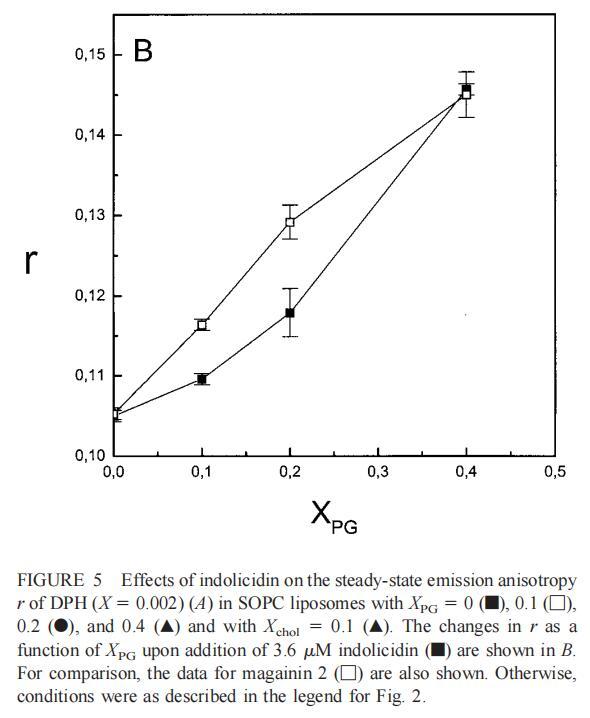 雖然熒光光譜顯示,馬蓋寧2和吲哚西啶對脂質(zhì)動力學(xué)的影響存在明顯差異,但也存在一些明顯的相似之處。因此,DPH各向異性r的增加表明,在存在酸性磷脂的情況下,這兩種肽都會導(dǎo)致?;滍樞虻脑黾樱@種影響的程度隨著XPG的增加而增加(圖3b和5b)。同樣,在膽固醇存在的情況下,兩種肽對芘熒光的有效猝滅也很明顯(圖2a和4a)。這可能與膽固醇的OH基團(tuán)和馬蓋寧的E19殘基之間的相互作用有關(guān)(Tytler等人,1995年),該肽在膜中具有跨膜取向。當(dāng)Xchol=0.1時,r值的增加是由于吲哚西丁所致,而馬加寧則無影響。這表明,在膽固醇存在的情況下,吲哚肽可能采用跨雙層取向,其長軸垂直于雙層平面。