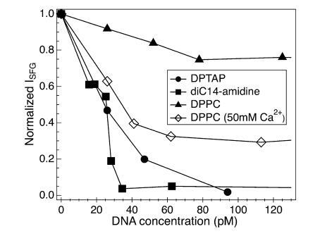 圖7(上圖)所示的壓縮等溫線清楚地表明,DNA對diC14氨基單層膜的影響,在很大的密度范圍內(nèi),是增加表面壓力,或等效地降低表面張力。也就是說,加入DNA后,表面生成的自由能總是變得更有利。然而,在沒有進(jìn)一步信息的情況下,這些實(shí)驗(yàn)幾乎無法深入了解表面熱力學(xué)變化的分子基礎(chǔ)。雙14-氨基單分子膜的CH區(qū)域的VSF光譜作為DNA濃度的函數(shù),以及由此產(chǎn)生的CH3SS/CH2 SS比率,提供了這樣的見解。如圖7(下圖)所示,向亞相添加DNA,即使在40 pM以下的體積濃度下,也會導(dǎo)致脂質(zhì)尾部順序的強(qiáng)烈增加。在解釋電子自旋共振研究的結(jié)果時,貝納蒂及其同事曾認(rèn)為,吸附的DNA使凝膠相雙氰胺雙層(低于23°C)流態(tài)化,并使液相雙層(高于23°C)僵化,從而有效地平滑了在沒有DNA的情況下急劇的熱相變。91我們的光學(xué)和壓力等溫線測量都是在略低于熔融溫度的情況下進(jìn)行的。我們的壓縮等溫線表明,DNA的作用是增加表面上單個鏈之間的相互作用(降低表面張力),而光學(xué)測量表明,鏈相互作用的增加導(dǎo)致脂質(zhì)尾部更有序。有趣的是,這些結(jié)果與這樣一種情況是一致的,即DNA的加入似乎會產(chǎn)生脂質(zhì),兩者之間的相互作用比沒有DNA時更強(qiáng)烈,尾巴比沒有DNA時更有序,鏈的流動性增強(qiáng)。這種脂鏈流動性和脂鏈順序的解耦類似于之前觀察到的膽固醇和DPPC混合物隨溫度變化的情況。92