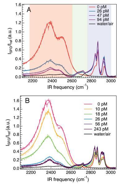 界面水的光譜響應(yīng)。圖2顯示了在2100-3100 cm-1范圍內(nèi),隨著亞相DNA濃度的增加,DPTAP、diC14氨基和DPPC單分子膜的VSF光譜。對這些數(shù)據(jù)的粗略檢查顯示出幾個特征。聚焦于圖2面板A,從低頻向高頻移動,很明顯,有一個巨大的雙峰結(jié)構(gòu),隨著DNA的加入,其振幅突然降低(透明的紅色矩形);一個小的、更高頻率的峰值(以≈2675 cm-1),隨著DNA(透明綠色矩形)的加入而增加;在2800-2950 cm-1的頻率范圍內(nèi)有幾個較窄的峰值(這些峰值是CH拉伸振動的結(jié)果,顯示在一個透明的藍(lán)色矩形中,下面將進(jìn)一步討論)。