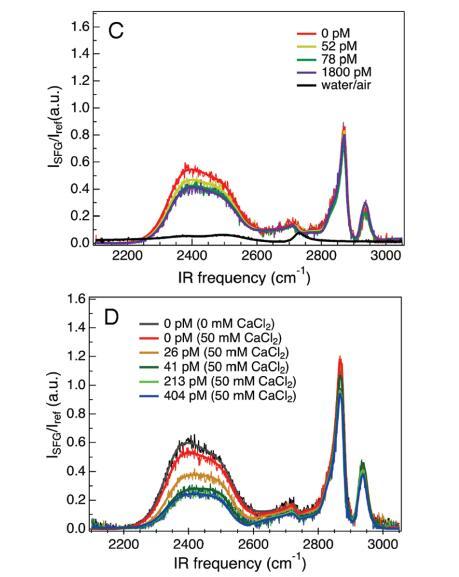 圖2。VSF光譜是OD拉伸區(qū)2100-2700 cm-1和CH拉伸區(qū)2850-2975 cm-1的DNA濃度的函數(shù)。陽離子脂質(zhì)單分子膜的脂質(zhì)密度為52?2/分子,兩性離子脂質(zhì)單分子膜的脂質(zhì)密度為47?2/分子。A組為DPTAP單層下的VSF光譜,B組為diC14氨基單層下的VSF光譜,C組為DPPC單層下的VSF光譜,D組為含有額外50 mM CaCl2的DPPC單層下的VSF光譜。所有實(shí)驗(yàn)中的亞相都是磷酸鹽緩沖的。每個面板中的單個光譜是具有不同濃度λ-DNA噬菌體的相同系統(tǒng)。每個面板中都顯示了該頻率窗口的磷酸鹽緩沖D2O光譜,以供比較。實(shí)體曲線使用公式1擬合數(shù)據(jù)。
