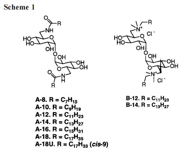 本文研究以海藻糖為間隔基的雙子座(方案1)。A系列由海藻糖組成,其6-和6′-羥基被長鏈酰胺取代。B系列在6-和6′位置有長鏈季銨鹽基團。我們選擇海藻糖作為糖間隔物并不是隨意的。首先,海藻糖是一種雙糖,允許兩條烴鏈相隔相當長的距離。雙子座中受限的分子內(nèi)鏈/鏈相互作用是一種結(jié)構(gòu)特征,過去僅對其進行了簡要研究。15秒后,海藻糖(一種從細菌、藻類、昆蟲和植物等多種自然來源中分離出來的糖)可以保護生物膜免受脫水的壓力。16因此,在生物膜的“細胞模擬”建模方面,我們對海藻糖雙子感興趣。17第三,從實用的角度來看,海藻糖很有吸引力,因為它包含兩個完全相同的D-葡聚糖單元。這簡化了化合物的合成和分析,與大多數(shù)其他雙糖相比,化學性質(zhì)不同的羥基數(shù)量減少了一半。但盡管對稱,合成純海藻糖雙子座的途徑(方案2和方案3)無疑是隨后物理化學的一個乏味的序言。