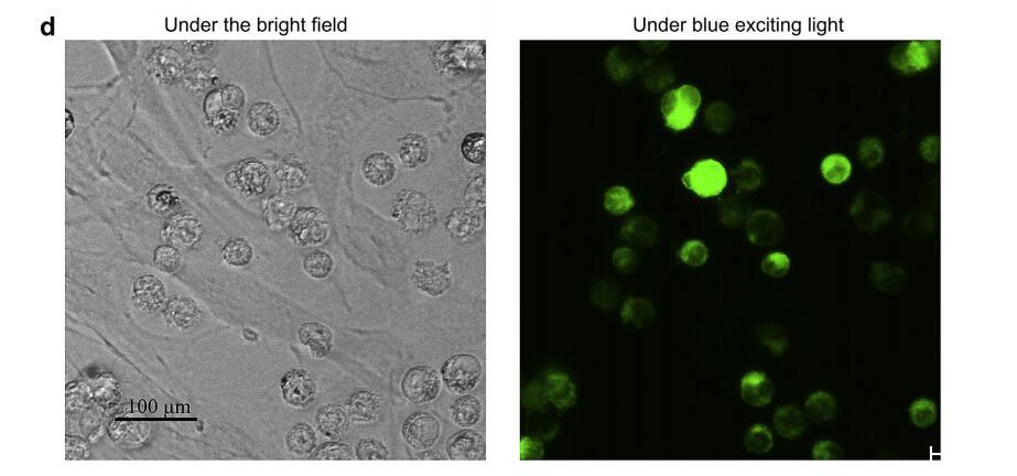 然后,我們進一步評估了基于體外共培養(yǎng)系統(tǒng)的細胞選擇性,該系統(tǒng)包含HL60癌細胞和HDFa原代細胞,它們與體內環(huán)境非常相似[8]。將最終濃度為20 mM的FITC-G(IIKK)3I-NH2添加到系統(tǒng)中,培養(yǎng)1 h后,用熒光顯微鏡觀察兩種細胞中的肽分布(圖1d)。很明顯,綠色熒光集中在懸浮和圓形HL60細胞中,而不是粘附和紡錘形HDFa細胞中,這再次表明肽具有良好的細胞選擇性,以及對癌細胞的快速識別。