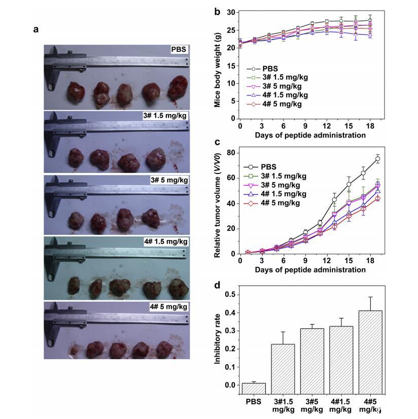 將人宮頸癌HeLa細胞接種于裸鼠皮下。腫瘤植入5天后,分別以1.5 mg/kg和5 mg/kg的劑量腹腔注射肽G(IIKK)3INH2和G(IIKK)4I-NH2。在給藥期間,未觀察到任何毒性跡象,如體重減輕和外觀不良(圖6b),盡管G(IIKK)4I-NH2顯示出更高的體外溶血性。與PBS中的陰性對照相比,這兩種肽對腫瘤生長表現(xiàn)出明顯的抑制作用,其中G(IIKK)4I-NH2表現(xiàn)出比G(IIKK)3I-NH2更好的療效(圖6c),這與它們的體外抗腫瘤趨勢一致。18天后,解剖腫瘤并稱重(圖6a和d)。在1.5 mg/kg和5 mg/kg劑量下,G(IIKK)3I-NH2治療組的腫瘤生長抑制率分別為0.23和0.31。G(IIKK)4I-NH2能產生更有效的抑制作用,在1.5 mg/kg和5 mg/kg劑量下,抑制率分別為0.32和0.41。這些數(shù)據(jù)表明,在小鼠異種移植模型中,螺旋肽可以有效地抑制腫瘤生長,而腫瘤細胞不能被完全清除。許多抗腫瘤藥物的不完全抑制作用已被廣泛觀察到,這可歸因于多種機制,例如藥物從腫瘤部位相對較快地清除,以及它們難以通過壞死區(qū)域擴散[42],但目前這組肽背后的確切原因有待進一步的機理研究。