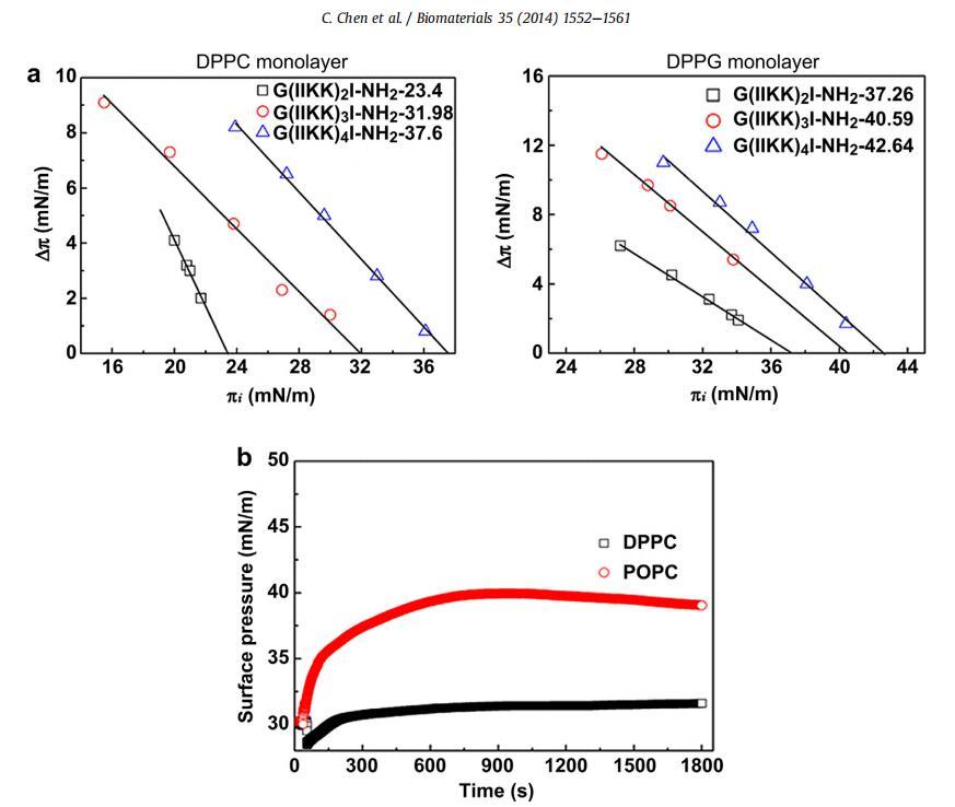 在這個階段,這些肽的選擇性背后的機制過程在很大程度上仍不清楚,但抗癌肽主要是膜活性的,它們對癌細胞的作用方式涉及膜破壞。此外,它們對癌細胞的選擇性殺傷與癌細胞的兩個關鍵細胞膜特征密切相關,即凈負表面電荷和更大的膜流動性[2,3,16]。為了了解肽和細胞膜之間的特殊相互作用以及分子水平上抗癌作用的基本過程,我們轉向使用脂質單層的膜模型。圖2a顯示了在最終濃度為3 mM的條件下,將G(IIKK)(2e4)I-NH2注入亞相時,DPPC(二棕櫚酰磷脂酰膽堿)和DPPG單層(分別模擬正常哺乳動物宿主細胞和癌細胞外膜)的表面壓力從不同的初始表面壓力(pi)增加(Dp),同時保持表面積不變。所有的肽都表現(xiàn)出對帶負電荷的DPPG單層的明顯偏好,而對兩性離子DPPC單層的親和力則要小得多。在Dp?0處對每個壓力圖進行外推,得出排除壓力,超過該壓力,肽不再能夠穿透脂質單層,從而導致表面壓力進一步增加。對于兩性離子DPPC單層,G(IIKK)2I-NH2的排斥壓力為23.4 mN/m,遠低于生物膜的30e35 mN/m生理范圍[17,18],這與其對紅細胞的毒性很小相符。相比之下,G(IIKK)(3e4)I-NH2的值分別增加到32.0和37.6 mN/m,這與它們的溶血活性增加一致。另一方面,對于帶負電荷的DPPG單層,排斥壓力分別顯著增加至37.3、40.6和42.6 mN/m,表明陽離子肽電荷和陰離子脂質頭基團之間的靜電相互作用起著關鍵作用。盡管DPPC和DPPG單分子膜對G(IIKK)2I-NH2的排斥壓差較大(參見補充數(shù)據(jù),圖S1),但其對后者的排斥壓僅略高于生物膜30e 35 mN/m的生理范圍,這與其殺死癌細胞的效率較低一致,因此,這種肽在癌癥治療中沒有吸引力。另一方面,G(IIKK)4I-NH2對兩性離子DPPC單分子膜的排斥壓力為37.6 mN/m,略高于30e35 mN/m的生理范圍,這與該系列中表現(xiàn)出的最高溶血能力一致。G(IIKK)3I-NH2顯示出中間值,DPPC單層的Dp值為32.0 mN/m,DPPG單層的Dp值為40.6 mN/m,這與體外細胞工作中的最佳細胞選擇性一致。