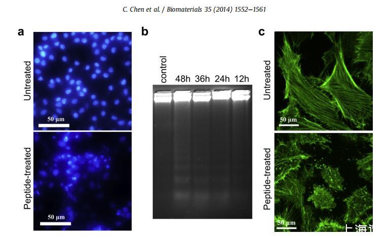 圖4。細胞凋亡的生化和形態(tài)學特征。(a)HeLa細胞與10 mM G(IIKK)3I-NH2孵育24小時前后的DAPI核染色。(b)HeLa細胞與10 mM G(IIKK)3I-NH2孵育后提取的基因組DNA的凝膠電泳分析。(c)在與10 mM G(IIKK)3I-NH2孵育24小時之前和之后,用FITC phalloidin對HeLa細胞進行F-肌動蛋白染色。