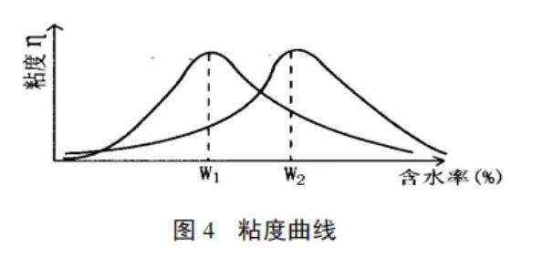 含水量高則流動(dòng)性好(即每個(gè)顆粒表層水膜厚),但凝聚性差,坯體易變形。因此,對(duì)每一企業(yè)來(lái)講,在原料處理、擠泥機(jī)等條件固定的前提下,摸索一個(gè)合適的成型含水率,既利于擠泥機(jī)成型,又利于磚坯強(qiáng)度。根據(jù)我們對(duì)幾十種黏土的試驗(yàn)數(shù)據(jù),每種黏土都有一個(gè)最佳含水率,在這種含水率的情況下,黏土的粘性(稠度)最好。典型的粘度曲線(見(jiàn)圖4):