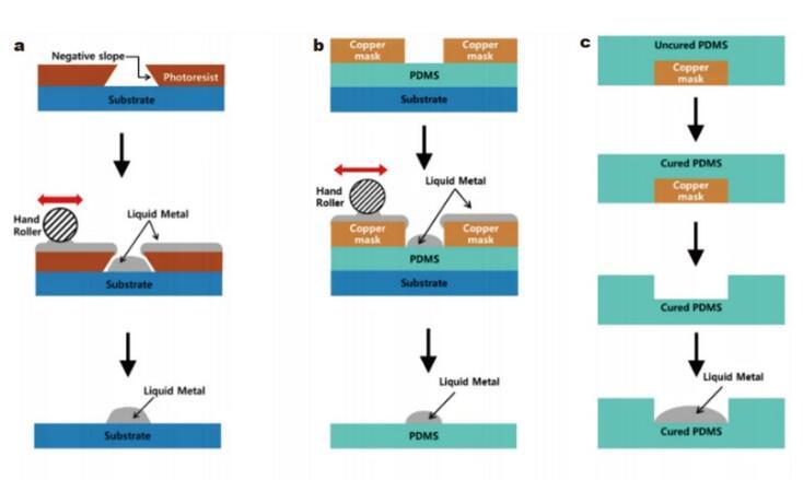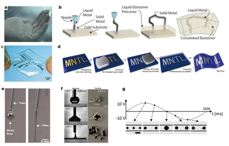 除了某些特定材料的表面(金、銅、錫等)可以潤(rùn)濕外,使用施加電壓等方法也可以改變液態(tài)金屬的潤(rùn)濕特性,使其在基材表面擴(kuò)散,在此基礎(chǔ)上可以制造出可拉伸的電子設(shè)備。