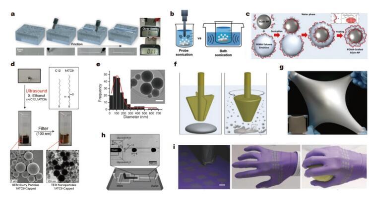 使用超聲和剪切等自上而下的方法將液態(tài)金屬?gòu)囊粋€(gè)大的液滴分割成許多微米級(jí)或納米級(jí)的液滴,并保證其粒度分布相對(duì)均勻。氧化層或其他人工形成的表面修飾將暫時(shí)阻止液滴的重新結(jié)合??衫祀娮釉O(shè)備的圖案可以通過(guò)排列這些液滴來(lái)繪制,這相當(dāng)于通過(guò)減小粒徑以增加比表面積(增加氧化層比例)進(jìn)而降低表面張力。