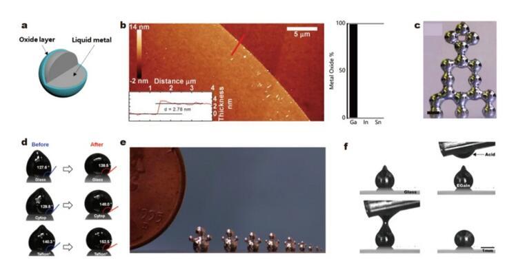 液態(tài)金屬在含有微量氧氣的環(huán)境中就會(huì)被氧化,形成0.5–5 nm的自限的氧化層,獲得保持非球面形狀的能力。