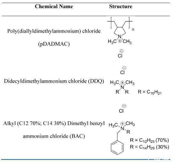 試劑和樣品制備。pDADMAC,Mv=8.5 kDa,作為28 wt%的水溶液從Poly Sciences Inc.獲得,pDADMAC,Mv=21和140 kDa,分別作為35和20 wt%的溶液從Sigmaldrich獲得。DDQ從Lonza(商品名-Lonza Bardac 2240)獲得,并以40 wt%的水溶液形式收到。BAC從Thor(商品名-Activide BAC 50 M)獲得,并以50 wt%的水溶液形式接收。通過在80°C的真空烘箱中干燥,通過重量法驗(yàn)證上述儲備溶液的濃度,直到未記錄進(jìn)一步的質(zhì)量損失。每個樣品進(jìn)行三次重復(fù)測量,并記錄平均結(jié)果。除非另有說明,否則表面活性劑和聚電解質(zhì)均按原樣使用,無需進(jìn)一步純化(表1)。