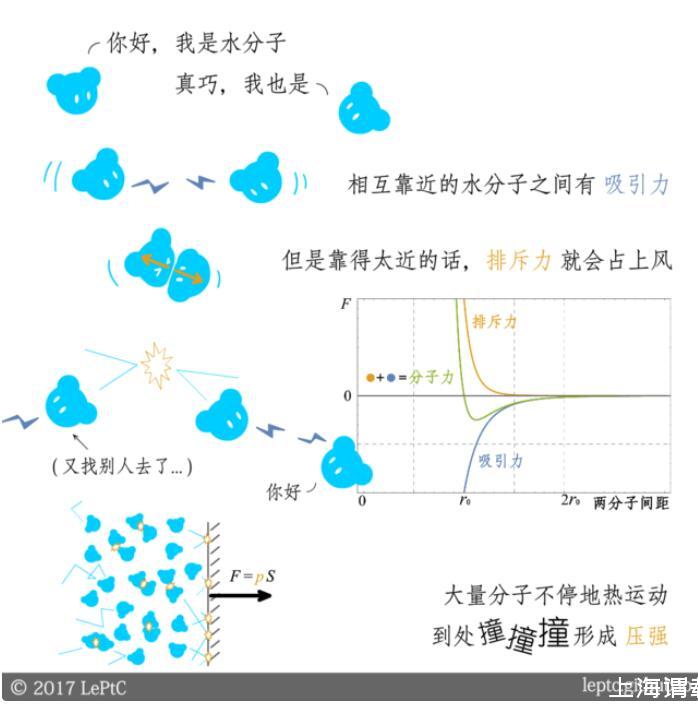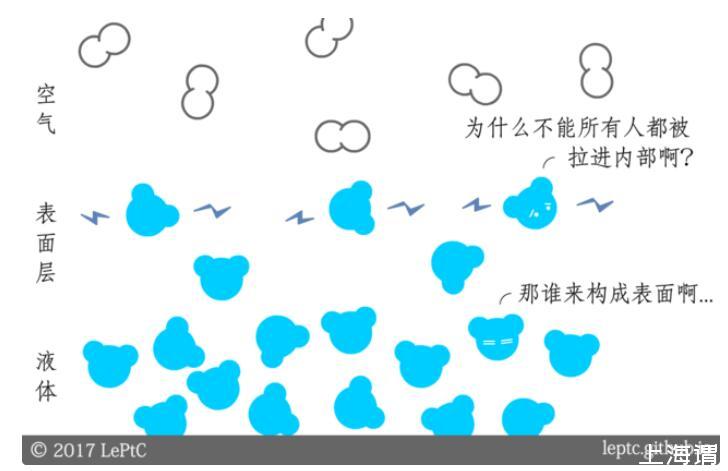 假設(shè)上下兩部分的壓強(qiáng)相同(壓強(qiáng)不同的情況將在第二節(jié)介紹),由于空氣對(duì)水分子的吸引力小于水分子之間的吸引力,所以位于表面的水分子會(huì)受到指向液體內(nèi)部的力,一部分水分子被拉進(jìn)液體內(nèi)部,表面層的水分子開(kāi)始變稀疏,直到吸引力減弱到和空氣接近時(shí)趨于平衡。表面層水分子的間距大于r0,因此吸引力占上風(fēng):