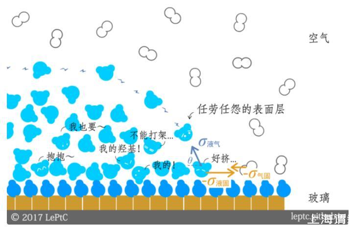 在氣體和液體之外,現(xiàn)在我們?cè)偌尤胄碌慕巧腆w表面。玻璃的表面對(duì)水分子非常有吸引力(雖然玻璃的主要成分是二氧化硅,但它的表面通常會(huì)因?yàn)閮r(jià)態(tài)不飽和而結(jié)合很多羥基)。如果水滴碰到的界面是玻璃,就會(huì)出現(xiàn)跟空氣相反的情況:接觸面的水分子比平衡時(shí)更擠,表面張力是擴(kuò)張的,表面能是負(fù)的,整坨水滴會(huì)希望自己跟玻璃的接觸面積越大越好(同時(shí)跟空氣接觸面積越小越好),形成特定的接觸角θ。這個(gè)角越小,意味著固體表面的親水性越強(qiáng)。
