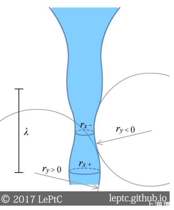 這一現(xiàn)象稱(chēng)為普拉托-瑞利不穩(wěn)定性(Plateau–Rayleigh instability)。我們?cè)谥鶢罱缑嫔霞右粋€(gè)波長(zhǎng)為λ的擾動(dòng),橫截面上的曲率變化rx是促進(jìn)柱的分裂的,但縱截面上ry的曲率變化會(huì)阻礙分裂,后者的效應(yīng)隨λ變長(zhǎng)而減弱。