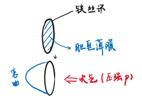 這時,咱們在一側(cè)吹氣(相當(dāng)于施加了一個壓強),平整的薄膜就發(fā)生“彎曲”——