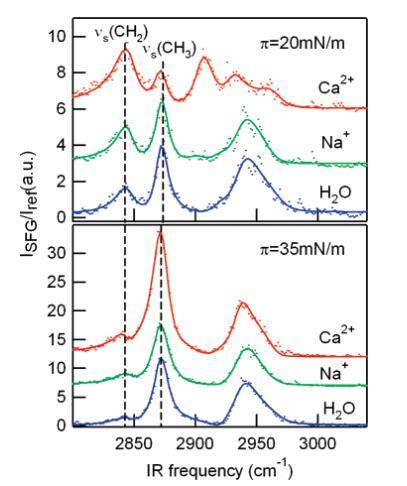 振動(dòng)和頻發(fā)生光譜學(xué)(VSFG)。VSFG是一種非線性振動(dòng)光譜技術(shù),可提供界面分子構(gòu)象順序和方向的表面特定信息,進(jìn)一步研究了在Ca2+存在下這種改變相行為的分子起源。21,22為了量化離子對(duì)脂質(zhì)尾部構(gòu)象的影響,在C-H拉伸區(qū)域收集VSFG光譜。沿等溫線測(cè)量了幾個(gè)表面壓力的光譜;圖5顯示了DPPC單層在20 mN/m和35 mN/m下三種不同亞相的光譜。可以觀察到五種振動(dòng)模式:以2876、2970和2938 cm-1為中心的峰值分別歸屬于CH3對(duì)稱拉伸、CH3反對(duì)稱拉伸和CH3費(fèi)米共振。22 CH2對(duì)稱和反對(duì)稱拉伸頻率約為2846和2920 cm-1。氘化DPPC脂質(zhì)單層(d62和d75 DPPC)上的VSFG實(shí)驗(yàn)顯示膽堿C-H伸展的信號(hào)非常低。